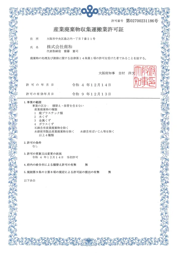 当社は大阪府より許可を受け、産業廃棄物の回収・運搬を行っております。地球環境問題の解決に向けて企業に対しても積極的なアプロ―チが求められる中、不法投棄や適切な処理がされないために発生する環境汚染といった問題の解決に貢献することを目指します。